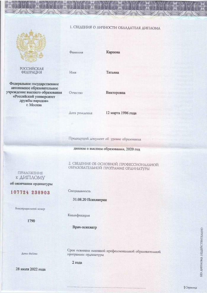 • 2022 г. – Ординатура: Российский университет дружбы народов (РУДН) (психиатрия).